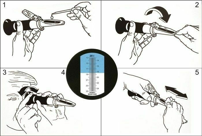 - Měření refraktometrem na med je velmi jednoduché, stačí kápnout kapku medu na zešikmený optický hranol přístroje, přiklopit krytku hranolu (med se rozprostře), podívat se proti světlu do okuláru přístroje, případně ho zaostřit a na stupnici. V zorném poli lze ihned odečíst hodnotu obsahu vody v medu podle rozhraní mezi osvětlenou a neosvětlenou částí.
