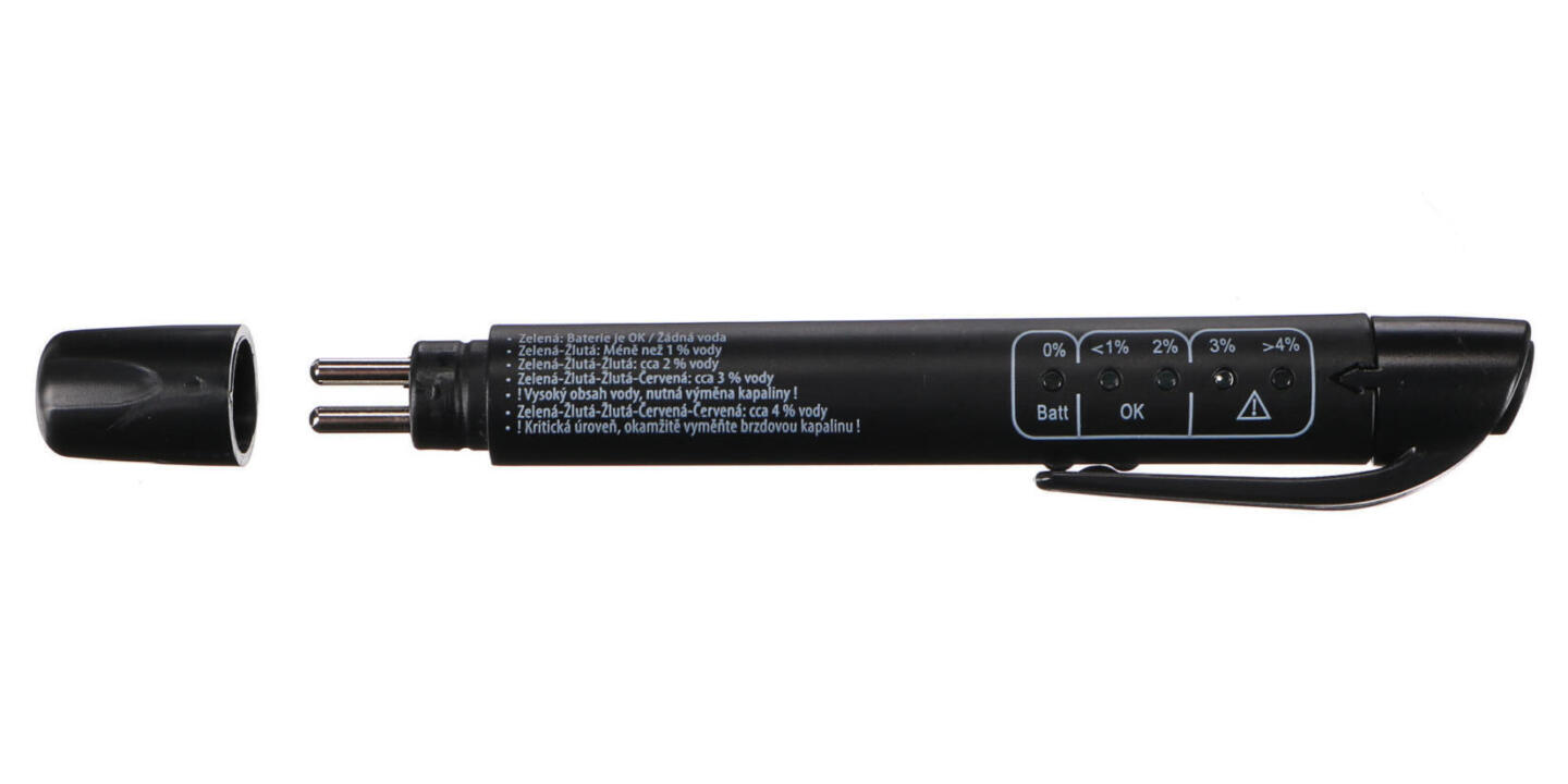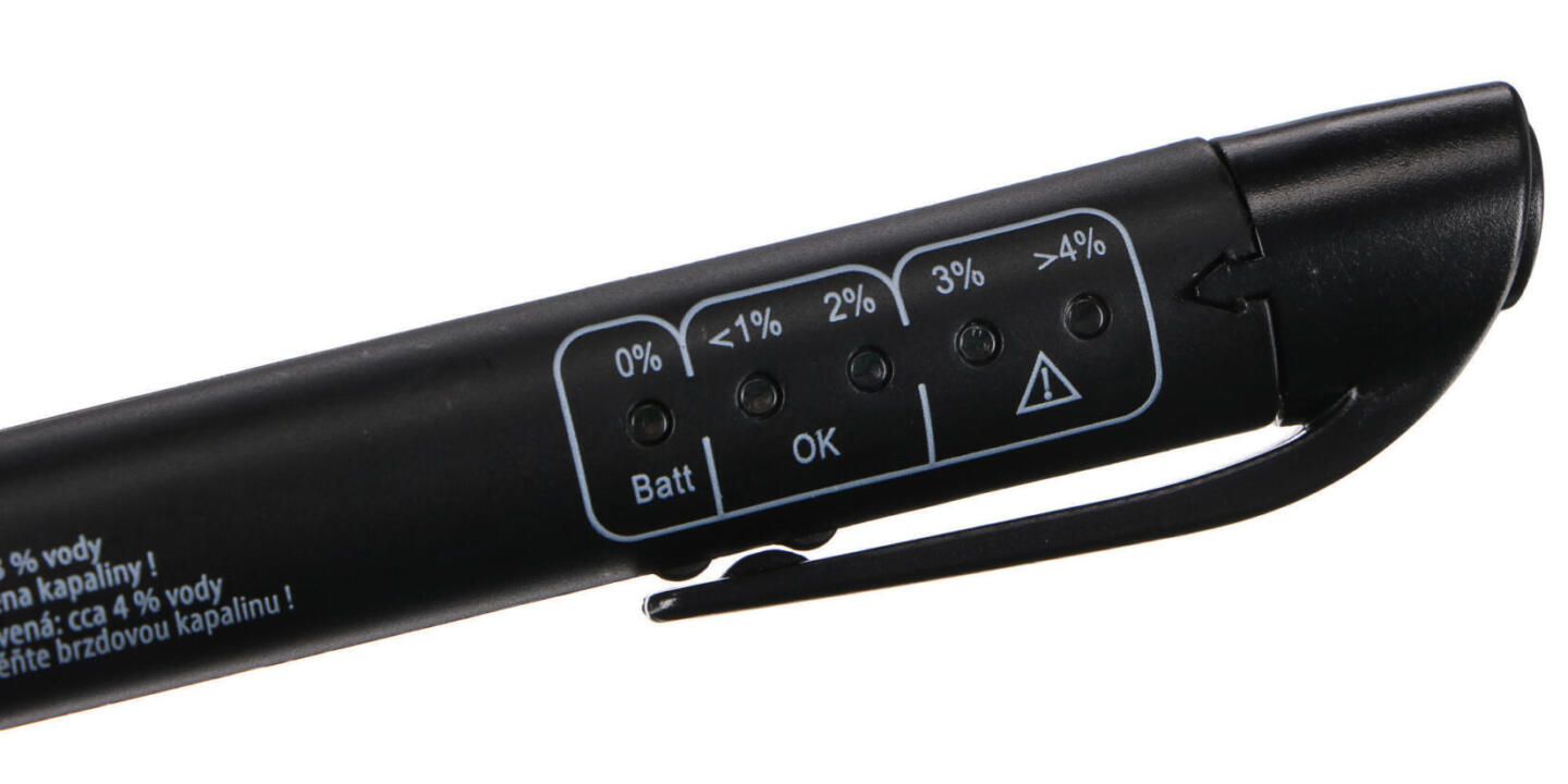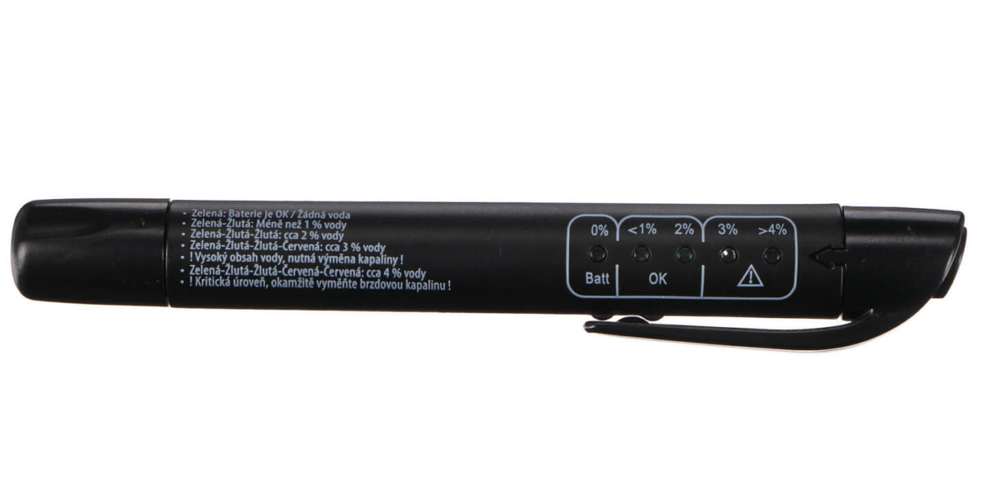- Typ měření: orientační stanovení obsahu vody v brzdové kapalině (glykolové DOT 3/4/5.1)