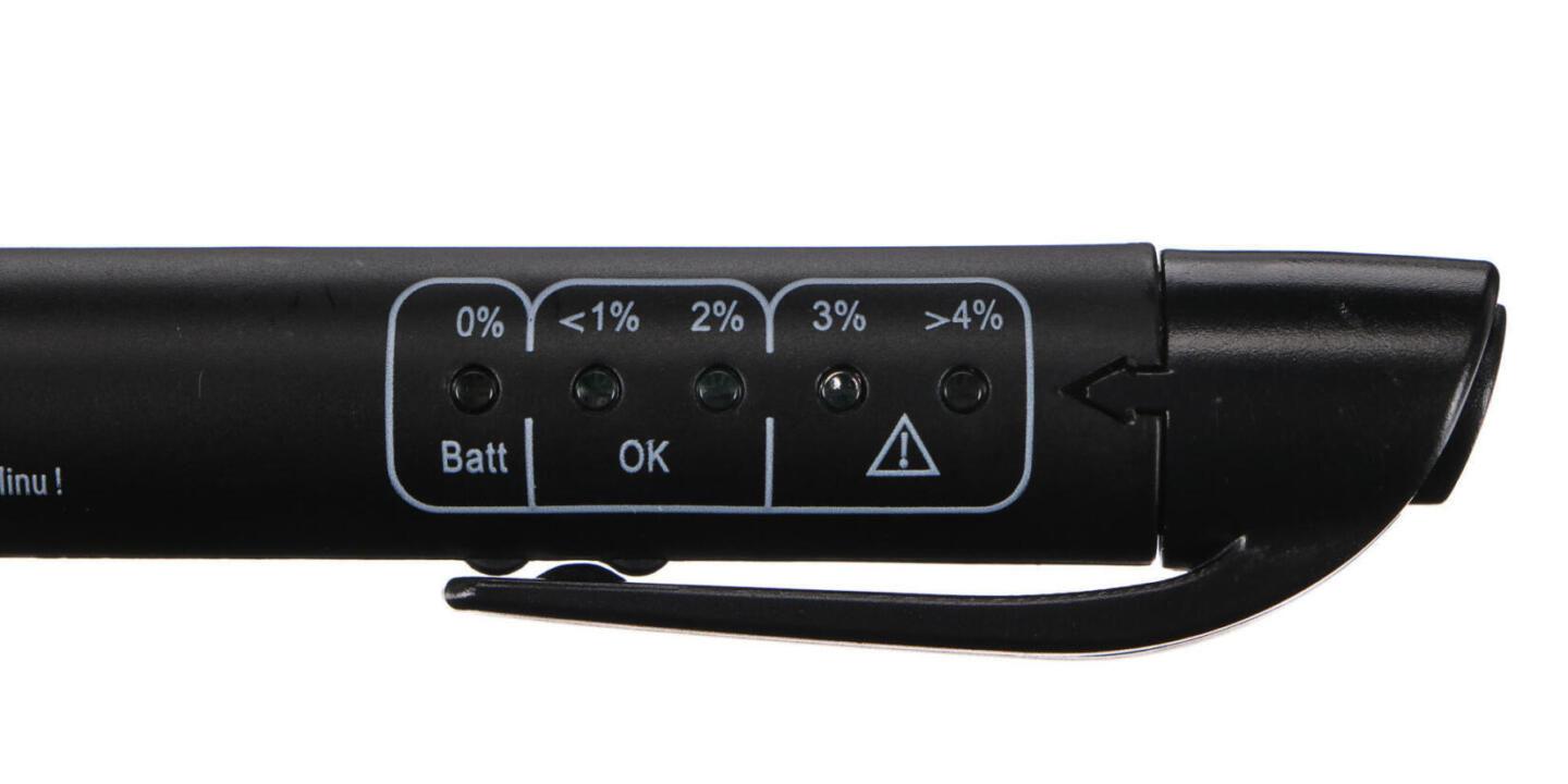 - Pět LED s jasnou škálou 0 % / <1 % / 2 % / 3 % / >4 %.