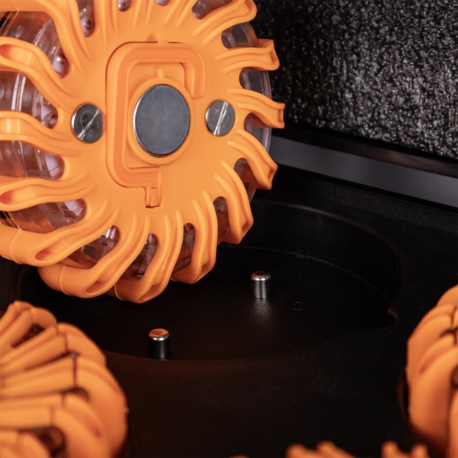 Set šesti oranžových LED výstražných světel s magnetem ve vodotěsném, nárazuvzdorném obalu. S aku baterií. Uložené v kompaktním kufříku.