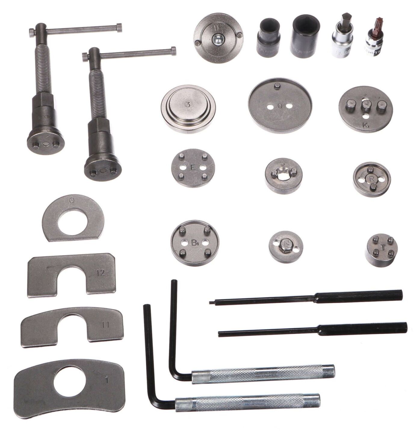 Ultimátní sada stlačováků brzdových pístů BRAKE SET BLACK s 50 díly v černém plastovém kufru vhodná k montáži/zpětnému vracení pístů/třmenů kotoučových brzd. Sada obsahuje pravotočivou i levotočivou stlačovací závitnici s magnetem, čtyři dorazy, dva imbusové klíče, úderníky, nádobku na mazivo a množství různých adaptérů. U vozidel s třmeny kotoučových brzd a s integrovanou jednotkou ruční brzdy se zpětné vracení brzdových pístů provádí zpětným otáčením, u ostatních vozidel zpětným stlačením těchto pístů.Obsah sady: