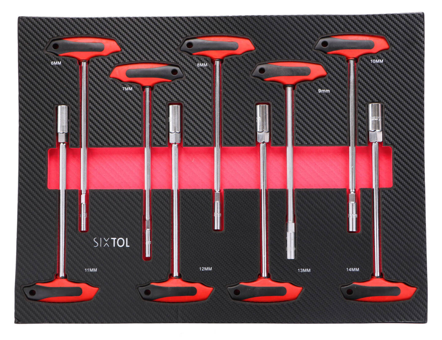 - 4. Šuplík – 9x T-ráčnové nástrčné klíče (T-bar socket set) - Velikosti: 6; 7; 8; 9; 10; 11; 12; 13; 14 mm
