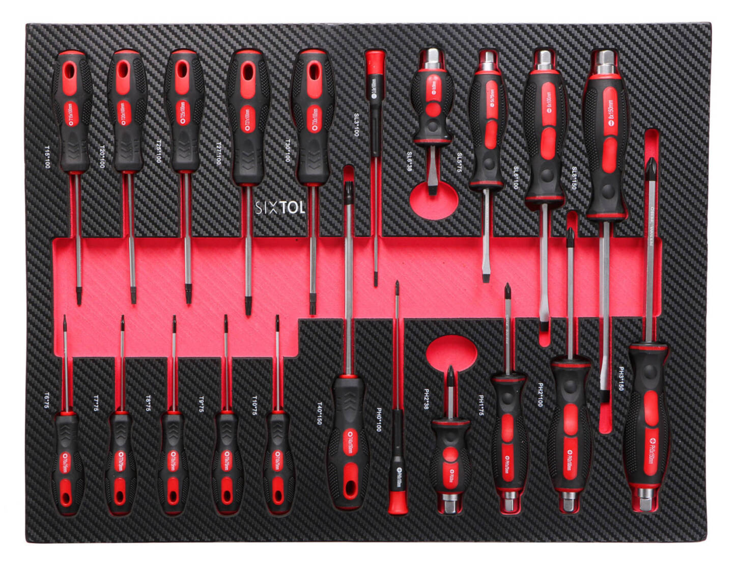 - 11x Klasické šroubováky: T6 × 75 mm; T7 × 75 mm; T8 × 75 mm; T9 × 75 mm; T10 × 75 mm; T15 × 100 mm; T20 × 100 mm; T25 × 100 mm; T27 × 100 mm; T30 × 100 mm; T40 × 150 mm