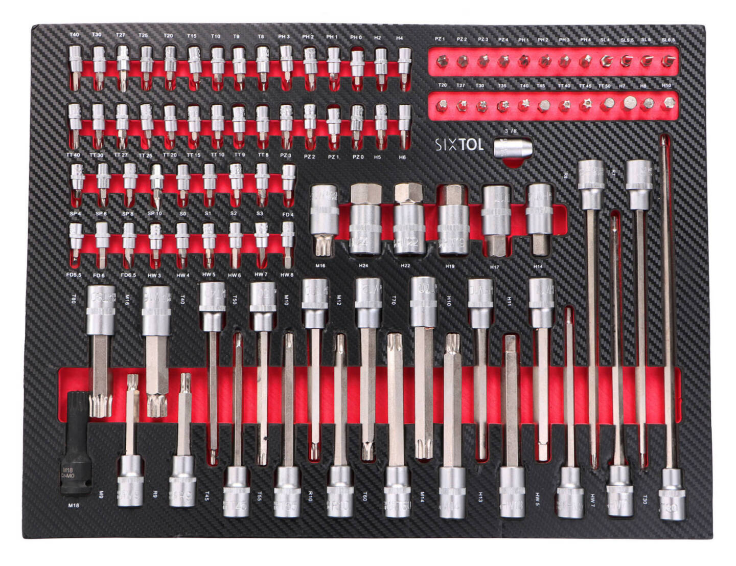 - 13x 1/2" bitové hlavice 140 mm: Torx: T40, T45, T50, T55, T60, T70; Spline: M10, M12, M14; Imbus: H10, H11, H13; R10