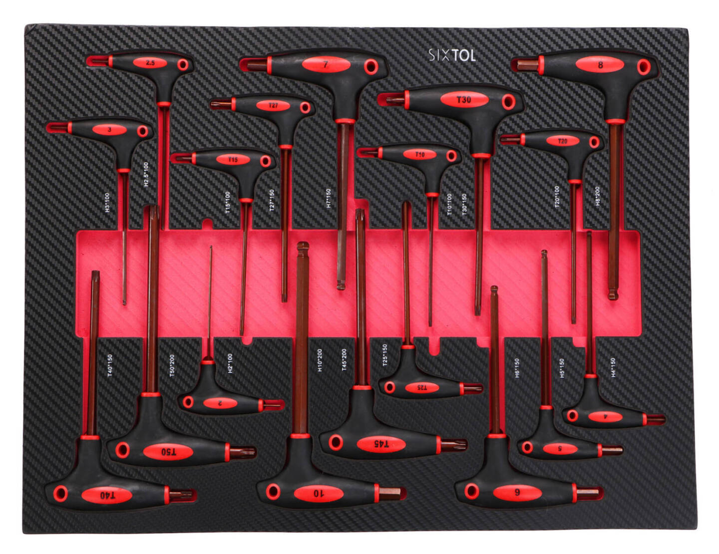 - 6. Šuplík – 18x T-klíče (materiál S2) - T-klíče TORX (T-handle wrench): T40 × 150 mm; T45 × 200 mm; T30 × 150 mm; T50 × 200 mm; T10 × 100 mm; T27 × 150 mm; T15 × 100 mm; T20 × 100 mm; T25 × 150 mm